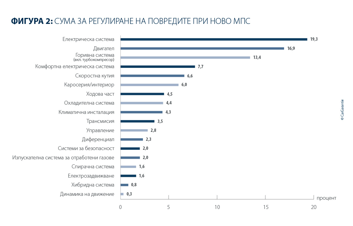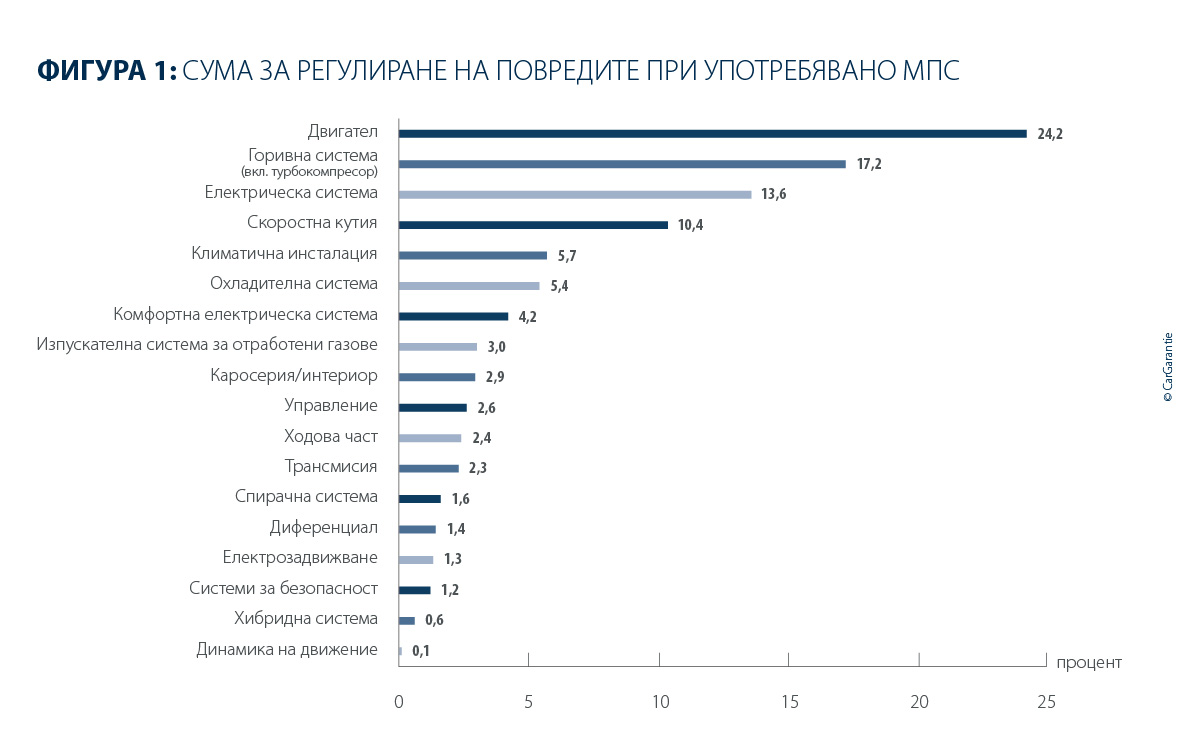 Двигателят остава и през 2025 г. най-скъпата група компоненти при употребяваните автомобили, като делът му в общата сума за уреждане на щетите възлиза на 24,2 %, което е леко под стойността от предходната година (26 %). Горивната система, включително турбокомпресора, заема второ място с 17,2 % (предходна година: 17,7 %), докато делът на електрическата система се повишава от 12,9 % на 13,6 %.