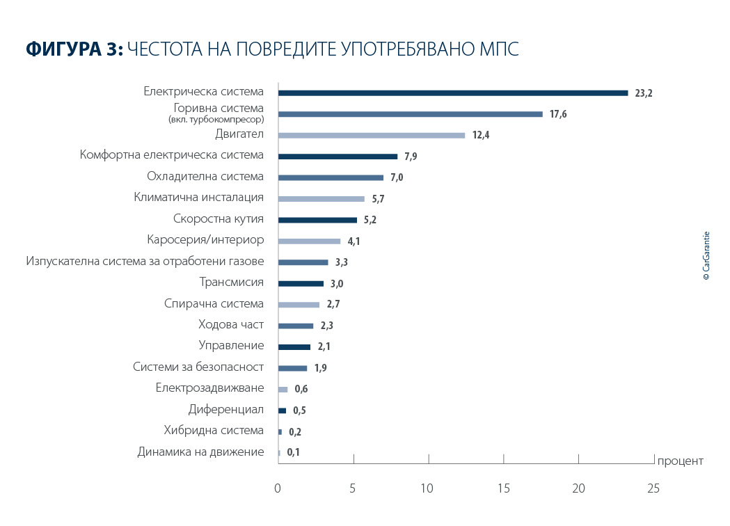 И по отношение на честотата на щетите се очертава позната картина. Електрическата система остава най-често засегнатата група компоненти както при новите, така и при употребяваните автомобили. При употребяваните автомобили нейният дял се повишава от 21,5 % на 23,2 %, докато при новите автомобили достига 28,8 %, което е значително над стойността от предходната година (26,1%). Нарастващата уязвимост на електрическата система потвърждава тенденцията, прогнозирана още през предходните години: с увеличаването на комплексността растат както интензивността на ремонтите, така и вероятността от дефекти. При употребяваните автомобили на второ място се нарежда горивната система, включително турбокомпресора, с дял от 17,6 % (предходна година: 18,2 %), а при новите автомобили – комфортната електроника с 15,2 % (предходна година: 14,9 %). Третото място при употребяваните автомобили заема двигателят с 12,4 % (предходна година: 13,5 %), докато при новите автомобили е горивната система с 10,8 % (предходна година: 12,9 %).