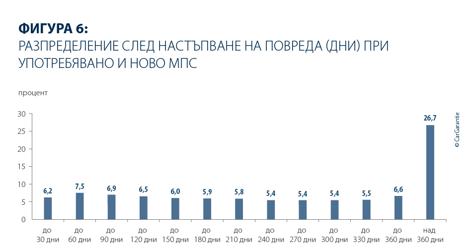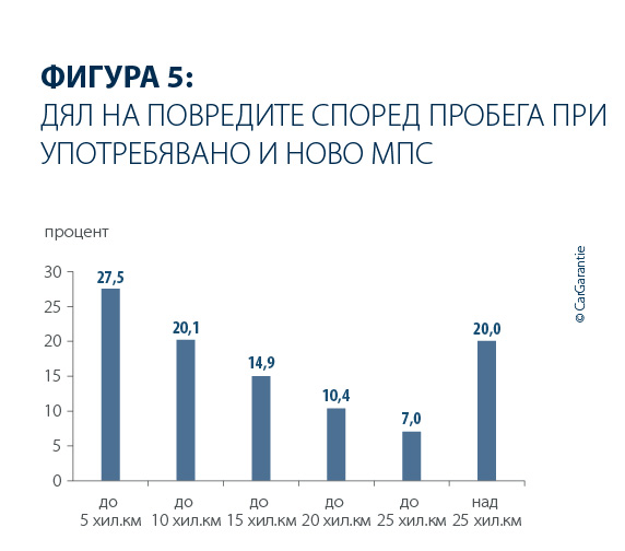 Моментът на настъпване на щетите остава до голяма степен стабилен. При употребяваните автомобили през 2025 г. в 27,5 % от случаите щетите са възникнали в рамките на първите 5 000 километра (предходна година: 27,1 %), докато 20,0 % от щетите са регистрирани едва след повече от 25 000 километра (предходна година: 21,0 %). Освен това 26,7 % от щетите при употребяваните автомобили настъпват едва след изтичането на повече от 360 дни (предходна година: 25,8 %).