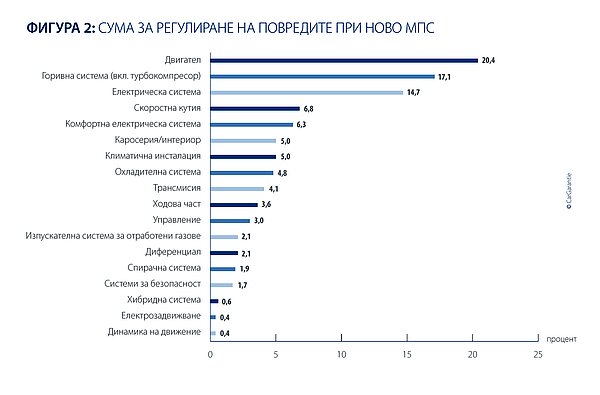 Както и през предходните години, двигателят запазва позицията си на най-скъп компонент за поддръжка и ремонт както при употребявани, така и при нови автомобили. При употребяваните автомобили неговият дял в сумата за регулиране на повредите се е увеличил с два процента до 25,9 % в сравнение с предходната година (23,9 %). При новите автомобили той е начело в списъка с 20,4 % (предходна година: 19,8 %). През 2022 г. 2-ро и 3-то място заемат горивната система, в това число турбокомпресор със 17,6 % (употребявани автомобили; предходна година: 18,0 %), респ. 17,1 % (нови автомобили; предходна година: 18,9 %) и електрическата система с 13,4 % (употребявани автомобили; предходна година: същата стойност), респ. 14,7 % (нови автомобили; предходна година: 13,2 %).