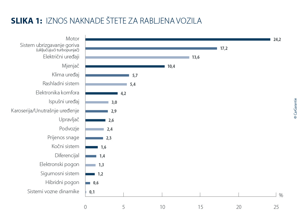 Motor ostaje i dalje najskuplja sklopna jedinica kod rabljenih vozila; njegov udio u ukupnom iznosu naknade štete iznosi 24,2 % u 2025. godini, čime je neznatno ispod prošlogodišnje vrijednosti od 26 %. Sustav goriva, uključujući turbopunjač, slijedi sa 17,2 % (prethodna godina: 17,7 %), dok električni sustav raste s 12,9 na 13,6 %.