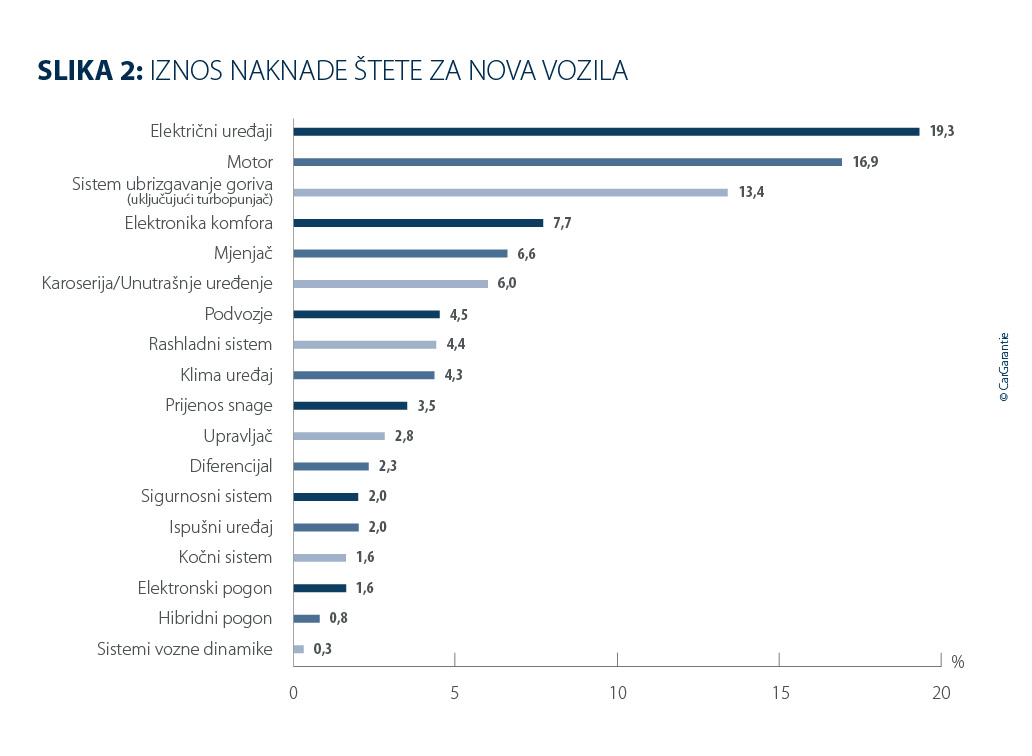 Kod novih vozila trend posljednjih godina postaje još izraženiji: električni sustav u 2025. doseže udio od 19,3 % i time prvi put prestiže motor. Motor pada na drugo mjesto s 16,9 % (prethodna godina: 18,4 %), a iza njega slijedi sustav goriva s 13,4 % (prethodna godina: 15,5 %).: 15,5 %).