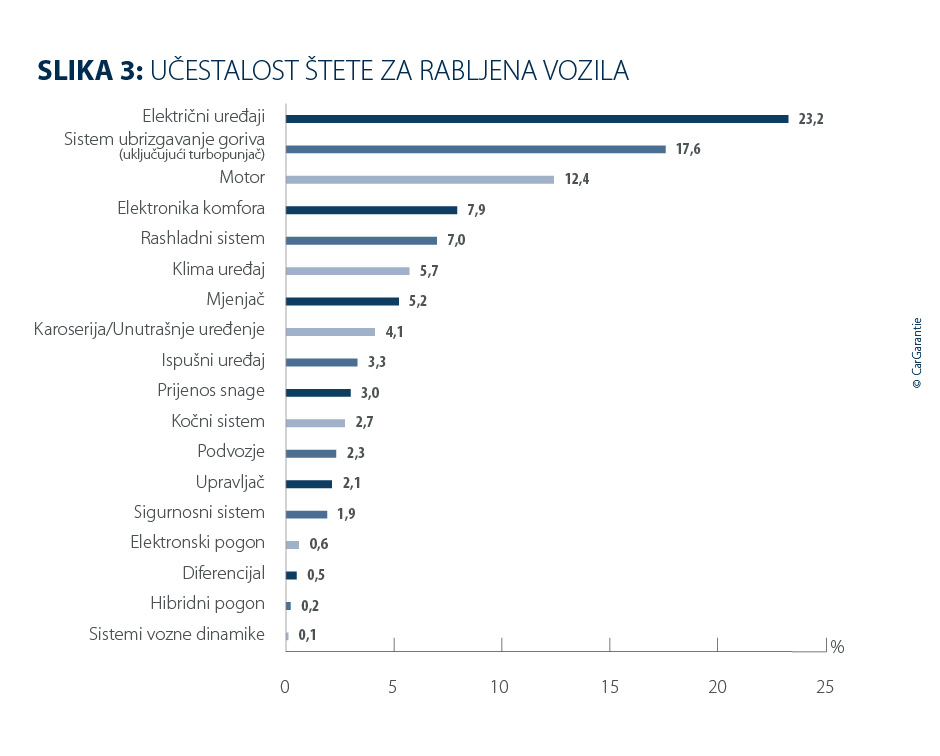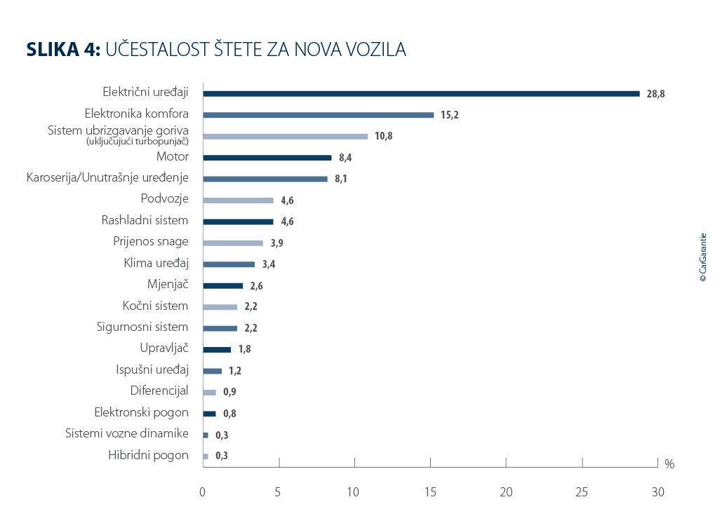 Također i u pogledu učestalosti šteta pojavljuje se poznata slika. Električni sustav ostaje, kako kod novih tako i kod rabljenih vozila, najčešće pogođena sklopna jedinica. Kod rabljenih vozila njegov udio raste s 21,5 % na 23,2 %, dok je kod novih vozila sa 28,8 % osjetno iznad prošlogodišnje vrijednosti od 26,1 %. Povećana osjetljivost električnih sustava time potvrđuje razvoj predviđen već prethodnih godina: s rastućom složenošću raste i intenzitet popravaka, ali i vjerojatnost kvarova. Kod rabljenih vozila na drugom mjestu nalazi se sustav goriva, uključujući turbopunjač, s 17,6 % (prethodna godina: 18,2 %), dok se kod novih vozila na drugom mjestu nalazi komfortna elektronika s 15,2 % (prethodna godina: 14,9 %). Treće mjesto zauzima kod rabljenih vozila motor s 12,4 % (prethodna godina: 13,5 %), a kod novih vozila sustav goriva s 10,8 % (prethodna godina: 12,9 %).