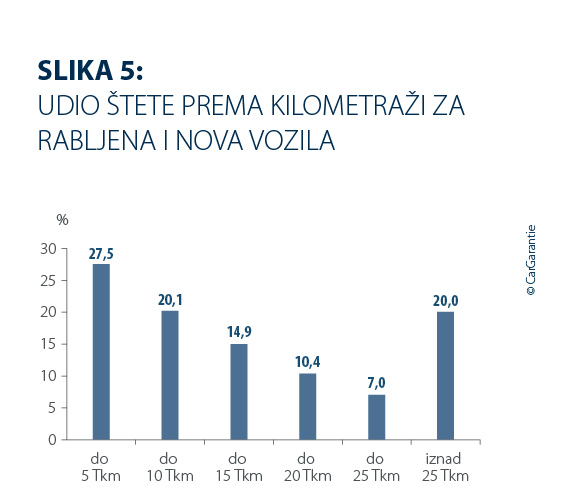 Vrijeme nastanka štete ostaje uglavnom stabilno. Kod rabljenih vozila u 2025. godini 27,5 % šteta pojavilo se unutar prvih 5.000 kilometara (prethodna godina: 27,1 %), dok je 20,0 % šteta zabilježeno tek nakon više od 25.000 kilometara (prethodna godina: 21,0 %).