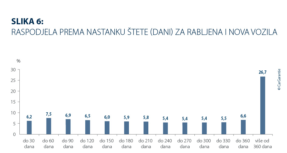 Kod rabljenih vozila 26,7 % šteta nastupa tek nakon više od 360 dana (prethodna godina: 25,8 %).