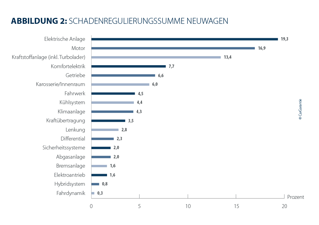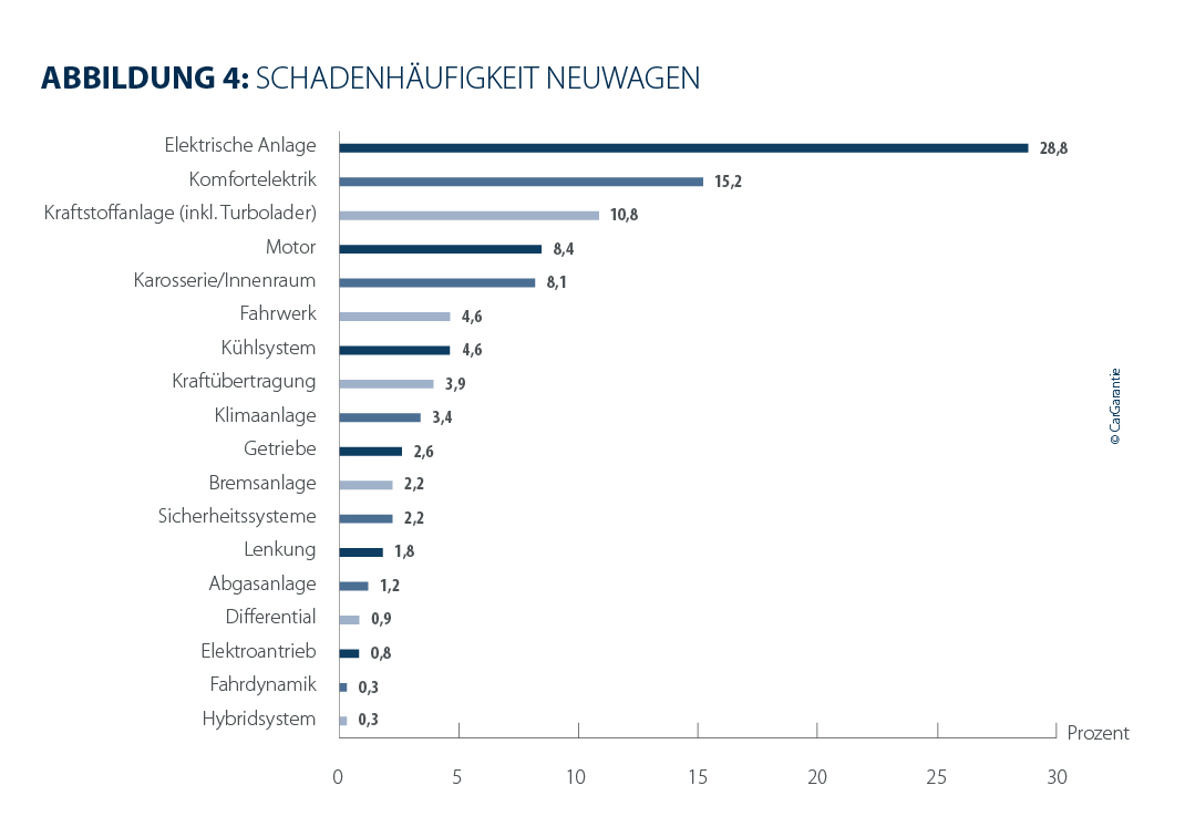 Auch bei der Schadenhäufigkeit zeigt sich ein vertrautes Bild. Die elektrische Anlage bleibt sowohl bei Neu‑ als auch bei Gebrauchtwagen die am häufigsten betroffene Baugruppe. Bei Gebrauchtwagen steigt sie von 21,5 % auf 23,2 %, während sie bei Neuwagen mit 28,8 % deutlich über dem Vorjahreswert von 26,1 % liegt. Die zunehmende Anfälligkeit elektrischer Systeme bestätigt damit die bereits in den Vorjahren prognostizierte Entwicklung: Mit wachsender Komplexität steigen sowohl die Reparaturintensität als auch die Wahrscheinlichkeit von Defekten. Bei Gebrauchtwagen folgt auf Platz 2 die Kraftstoffanlage inklusive Turbolader mit 17,6 % (Vorjahr: 18,2 %), bei Neuwagen die Komfortelektrik mit 15,2 % (Vorjahr: 14,9 %). Platz 3 nimmt bei Gebrauchtwagen der Motor mit 12,4 % ein (Vorjahr: 13,5 %), bei Neuwagen die Kraftstoffanlage mit 10,8 % (Vorjahr: 12,9 %).