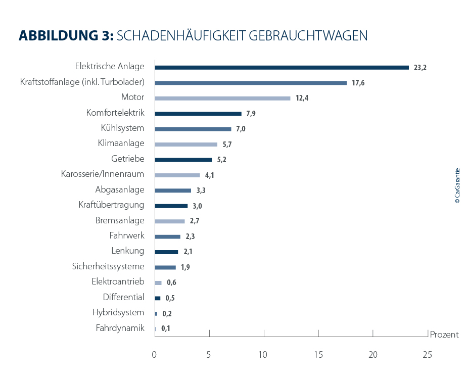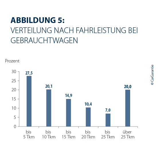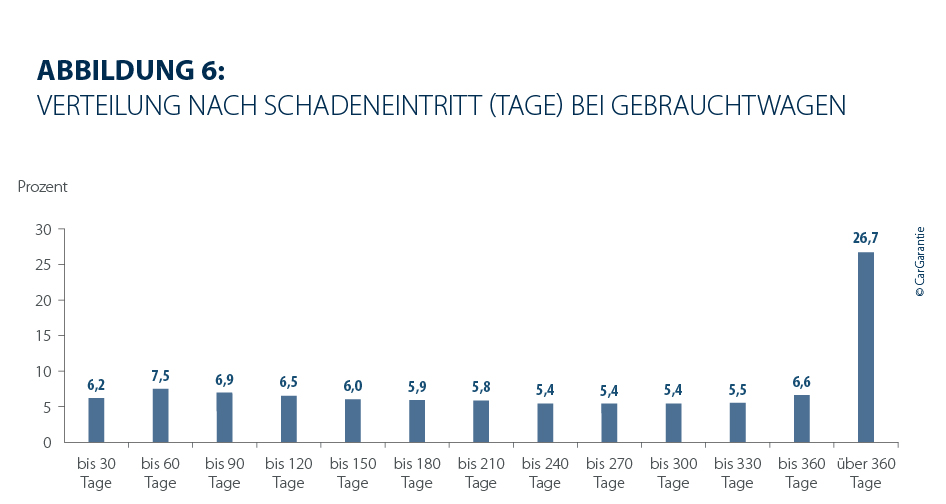 Der Zeitpunkt des Schadeneintritts bleibt weitgehend stabil. Bei Gebrauchtwagen traten 2025 in 27,5 % der Fälle die Schäden innerhalb der ersten 5.000 Kilometer auf (Vorjahr: 27,1 %), während 20,0 % der Schäden erst nach mehr als 25.000 Kilometern registriert wurden (Vorjahr; 21,0 %). 26,7 % der Schäden bei Gebrauchtwagen treten erst nach über 360 Tagen auf (Vorjahr: 25,8 %).