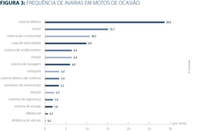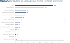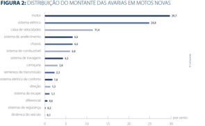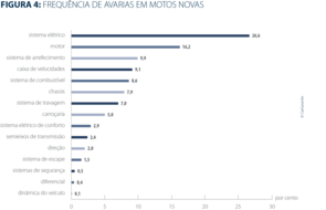 Em 2024, o sistema elétrico continuará a ser responsável pela maior parte das avarias em motos novas e de ocasião. Este apresenta 28,6% das avarias das motos de ocasião (ano anterior: 27,0%) e 26,6% em motos novas (ano anterior: 28,5%). O motor segue em 2.º lugar em ambos os setores: 15,1% nas motos de ocasião (ano anterior: 14,2%) e permanece nos 16,2% para as motos novas. Existem diferenças no 3.º lugar: no caso das motos de ocasião, o sistema de combustível representa 10,7% (ano anterior: 11,3%) e nas motos novas o sistema de arrefecimento passa a ocupar o 3.º lugar, com 9,9%. No ano anterior encontrava-se apenas em 5.º lugar, com um valor de 6,0%.