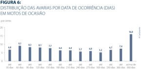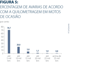 Em 2024 as avarias ocorreram um pouco mais cedo do que no ano anterior. Em 2024, 70,7% das avarias em motos de ocasião ocorreram logo durante os primeiros 5.000 km após o início da garantia. No ano anterior, este valor era de 69,2%. Isto também se reflete na ocorrência de avarias logo nos primeiros dias: apenas 16,0% das avarias ocorreram após mais de 360 dias. No ano anterior, este valor era de 17,5%.
