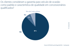 O estudo mostra que as garantias para veículo de ocasião são atualmente uma prática comum no comércio especializado. 88% dos concessionários inquiridos veem-nas como uma característica essencial de qualidade. Esta avaliação é particularmente acentuada entre as grandes empresas (96%) e os concessionários de marcas premium (94%). 84% dos concessionários mais pequenos também concordam. A garantia é, por isso, cada vez mais percebida como um elemento que proporciona confiança e que sublinha o profissionalismo e a fiabilidade do fornecedor.