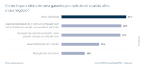 O estudo mostra que as garantias não só mitigam os riscos, como também fortalecem a confiança dos clientes. 67% dos concessionários afirmam que oferecer garantias aumenta a confiança nos seus veículos. 62% veem isto como uma clara vantagem competitiva em relação às vendas privadas. 61% referem que, com uma garantia, os clientes se sentem tão protegidos como quando compram um veículo novo. De acordo com 46% dos concessionários, uma garantia pode também aumentar a predisposição para comprar veículos elétricos de ocasião.