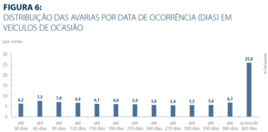 Há apenas algumas alterações nas estatísticas relativamente ao momento da ocorrência de avarias: em 2024, 27,1% das avarias em veículos de ocasião surgiram durante os primeiros 5.000 km. No ano anterior, este valor era de 27,6%. Apenas 21,0% dos danos ocorreram após mais de 25.000 km (ano anterior: 21,2%); fig. 5. A ocorrência de avarias durante os primeiros dias é quase idêntica: à semelhança do ano anterior, 25,8% das avarias em veículos de ocasião só surgiram após mais de 360 dias (Fig. 6).