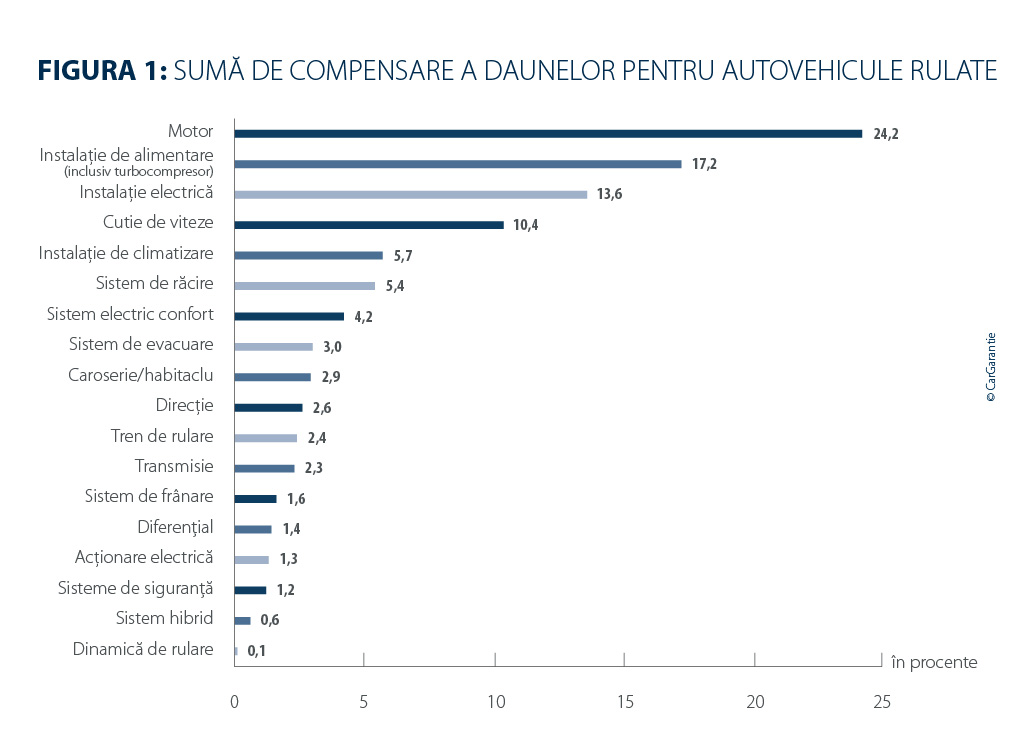 Motorul rămâne, în cazul vehiculelor rulate, în continuare cea mai costisitoare grupă de componente; ponderea sa în suma totală a despăgubirilor pentru daune se situează în 2025 la 24,2 %, fiind astfel ușor sub valoarea de 26 % din anul precedent. Sistemul de alimentare cu combustibil, inclusiv turbocompresorul, urmează cu 17,2 % (anul precedent: 17,7 %), în timp ce instalația electrică crește de la 12,9 % la 13,6 %. În cazul vehiculelor noi, tendința ultimilor ani devine și mai evidentă: instalația electrică ajunge în 2025 la o pondere de 19,3 %, depășind pentru prima dată motorul. Motorul scade pe locul al doilea, cu 16,9 % (anul precedent: 18,4 %), iar pe poziția a treia se află sistemul de alimentare cu combustibil, cu 13,4 % (anul precedent: 15,5 %).