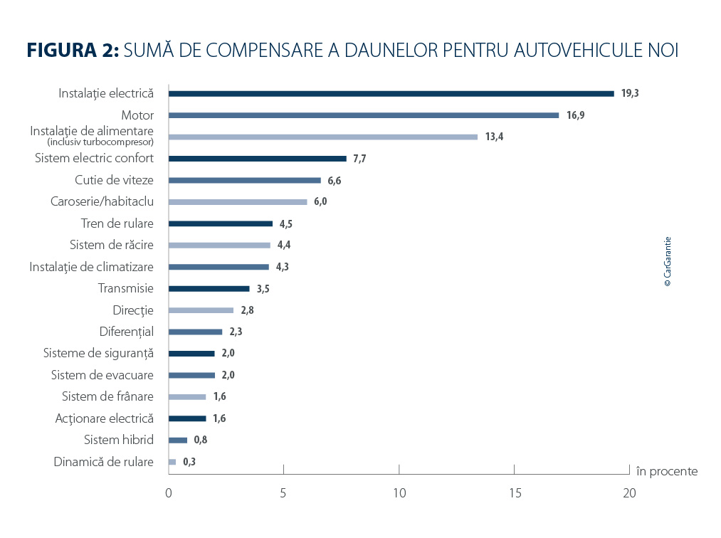 Ca în fiecare an, CarGarantie a analizat aproximativ un milion de contracte de garanție expirate pentru vehicule noi și rulate, cu scopul de a determina costurile medii de reparație și de a evidenția principalele tendințe privind frecvența daunelor și valoarea acestora. Rezultatele arată că, în timp ce creșterea semnificativă a costurilor se datorează, pe de o parte, provocărilor economice globale, complexitatea tehnologică tot mai ridicată a vehiculelor moderne amplifică, pe de altă parte, presiunea financiară. Instalațiile electrice, sistemele electronice de control și numeroase componente sensibile reacționează foarte ușor la defecțiuni – iar reparațiile devin, în consecință, tot mai laborioase.