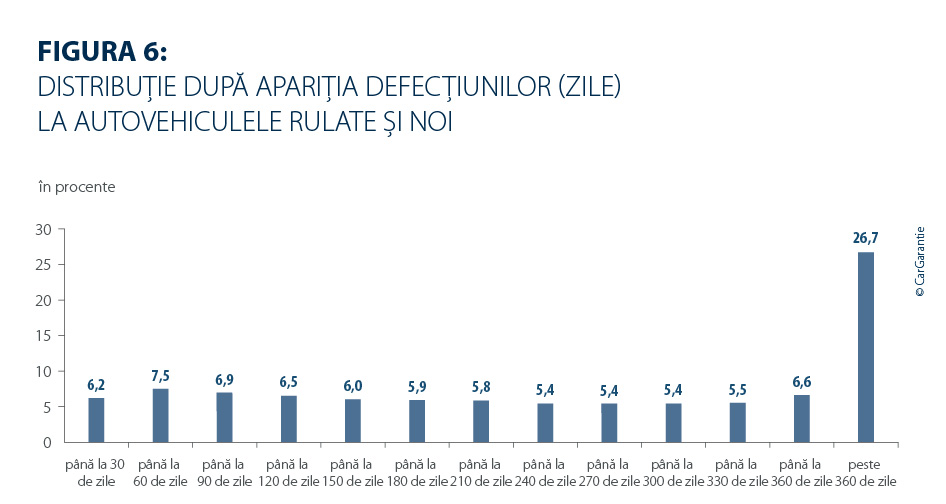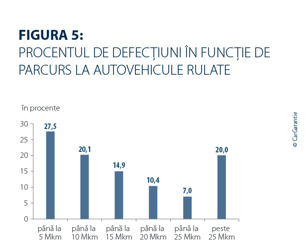 Momentul producerii daunelor rămâne în mare parte stabil. La vehiculele rulate, în 27,5 % din cazuri, defecțiunile din 2025 au apărut în primele 5.000 de kilometri (anul precedent: 27,1 %), în timp ce 20,0 % dintre daune au fost înregistrate abia după mai mult de 25.000 de kilometri (anul precedent: 21,0 %). 26,7 % dintre daunele la vehiculele rulate apar abia după mai mult de 360 de zile (anul precedent: 25,8 %).